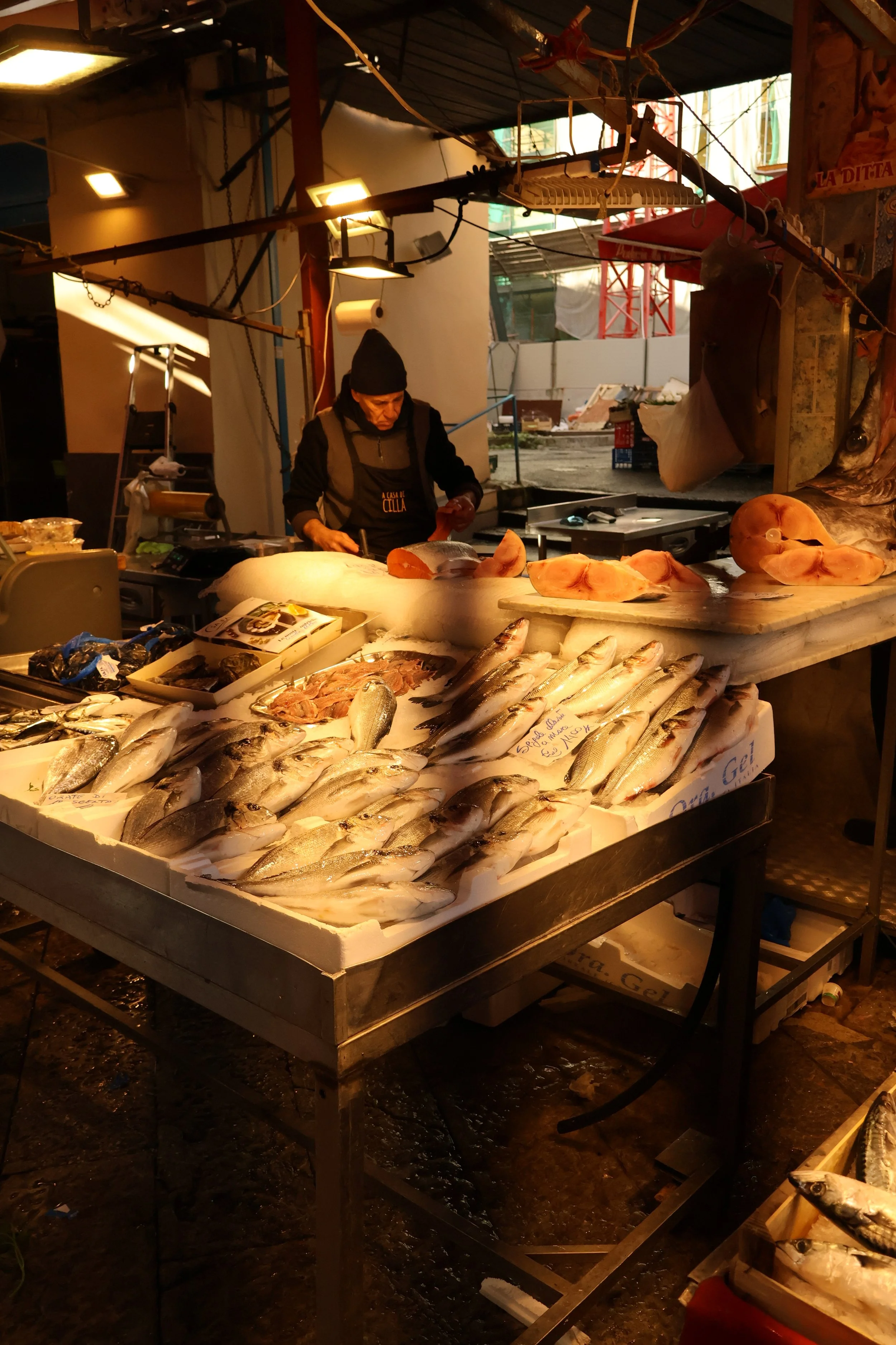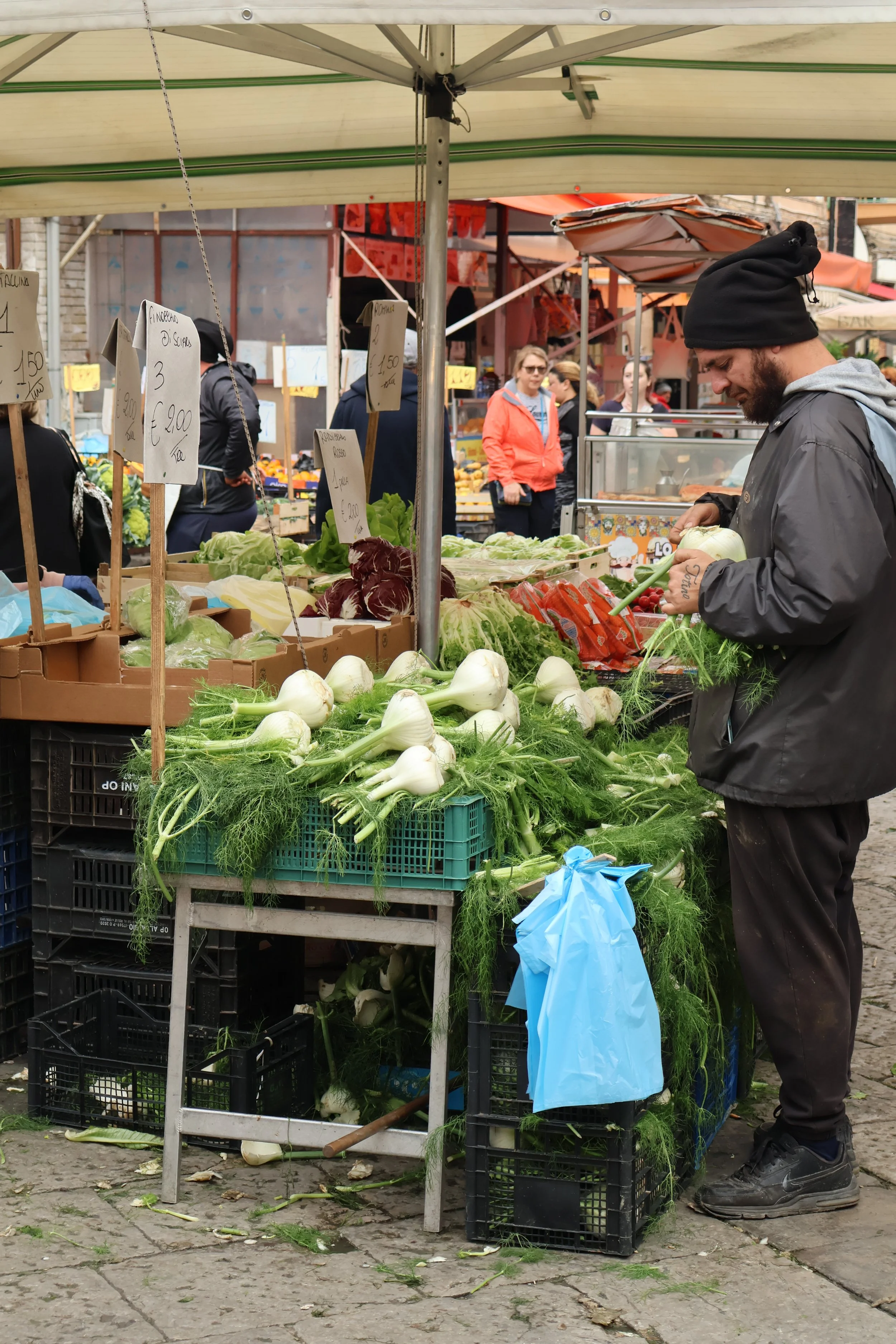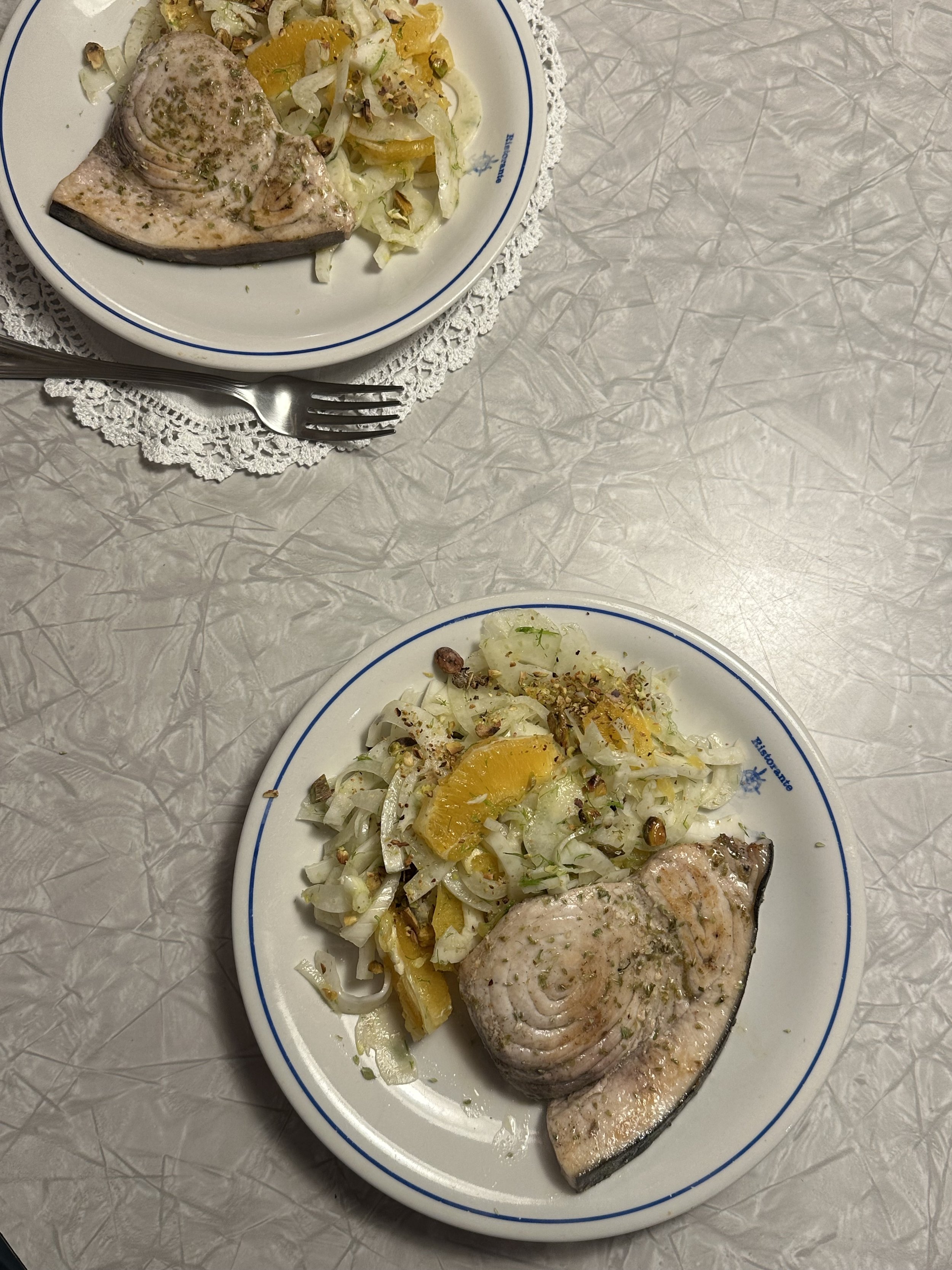 With space to breathe, choosing what to buy feels more deliberate. Ideas come fast, matching the energy of the markets themselves. And despite the flood of possibilities, the decision more or less makes itself: swordfish, still local and still in season, paired with a crisp fennel and orange salad and finished with chopped pistachio from Bronte.