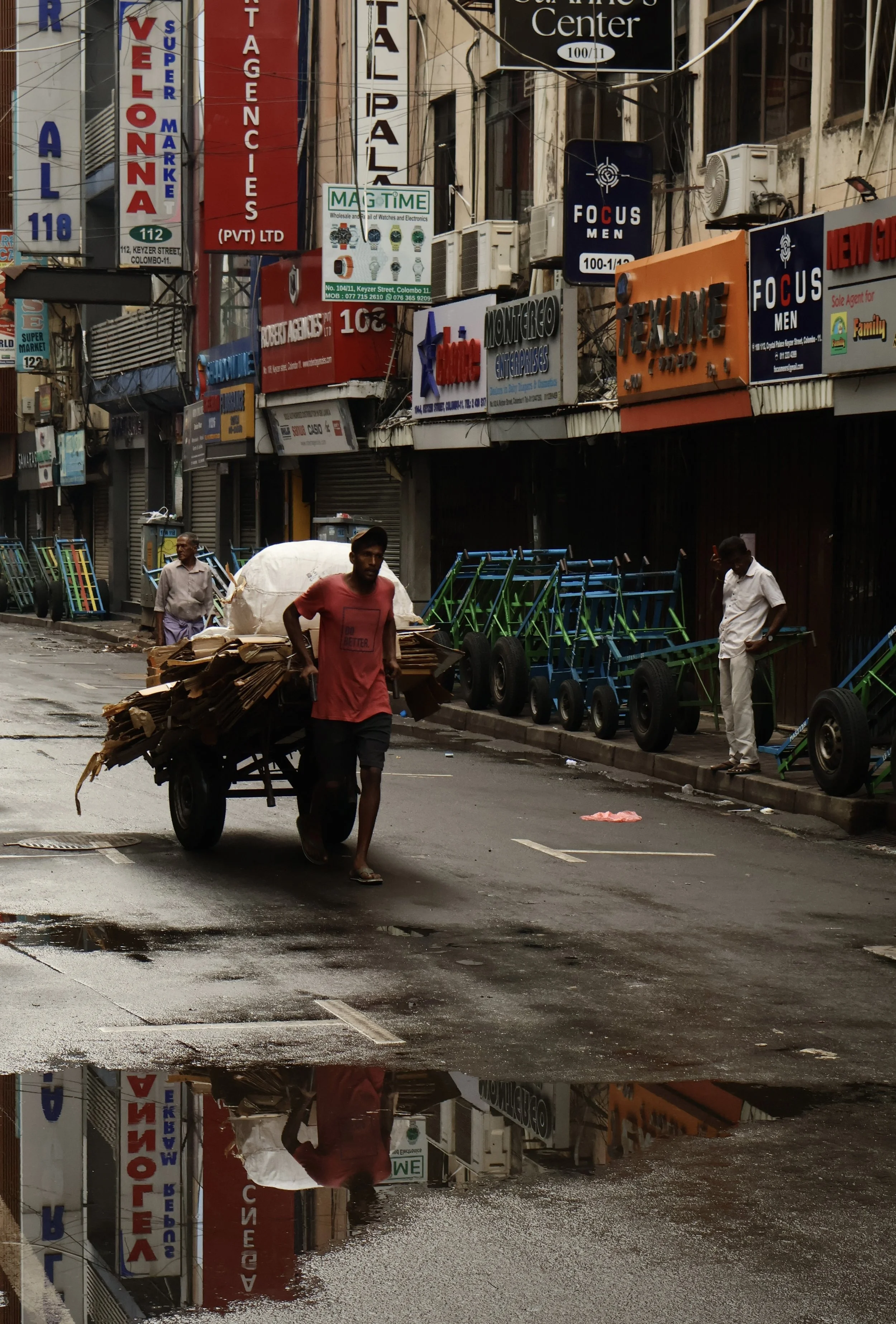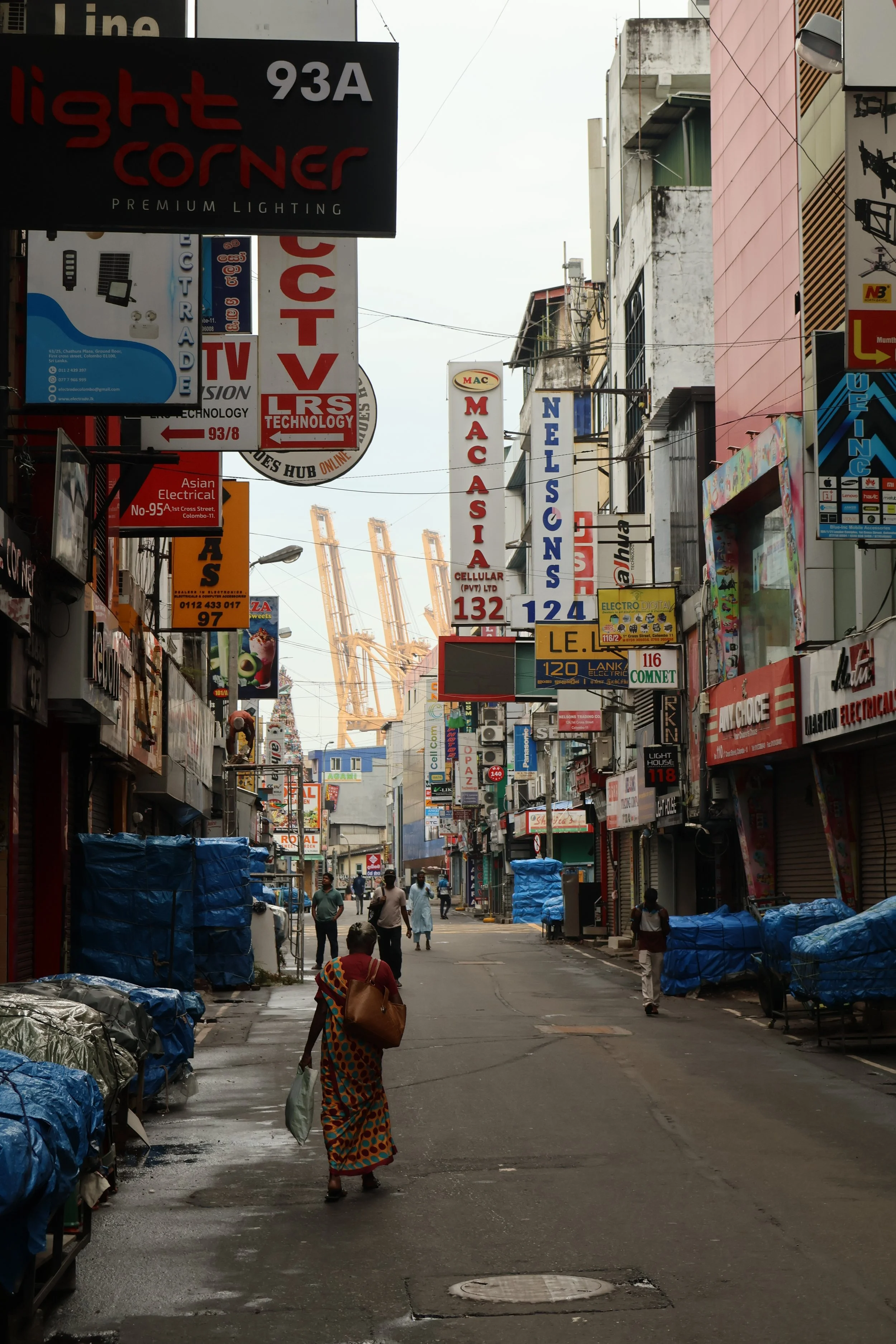 I walk on and head to explore the surrounding streets. Down 2nd Cross Street it is still quiet, but things are beginning to stir as market vendors set up their stalls for the day. I have a clear view of the jumble of signs fighting for attention from the buildings lining the street, advertising everything from clothing, to watches, to baby items.