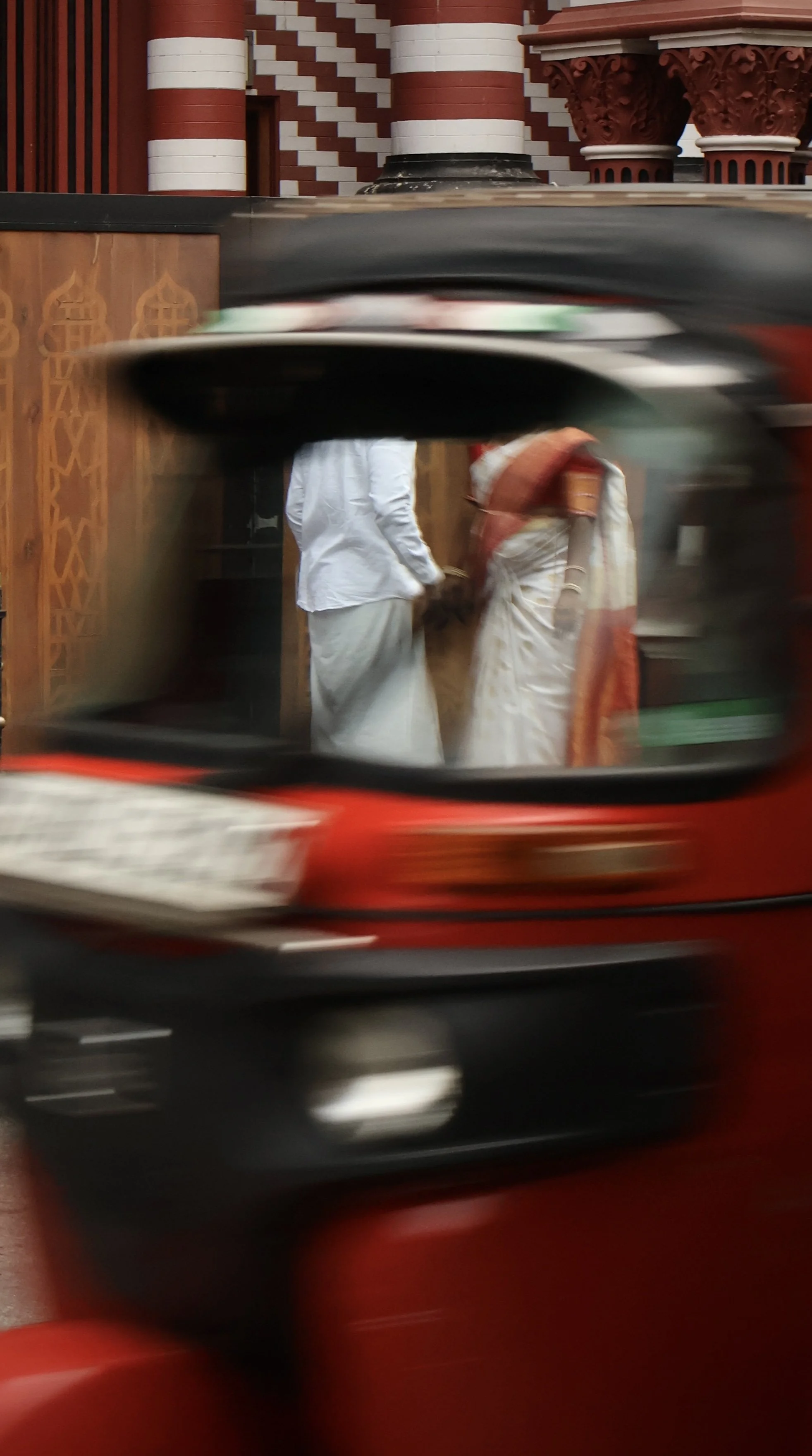 While I do so, a small crowd approaches the mosque and I realise it’s a wedding photo shoot. I hang back and muster the confidence to take a photo of the happy couple, stood outside the entrance. I watch on with no real purpose and then, after a short while, find the nerve to attempt a shot of the pair holding hands, through the window of a passing tuk tuk. I somehow manage it first time and I’m quietly thrilled that my fairly limited technical ability with a camera pays off.